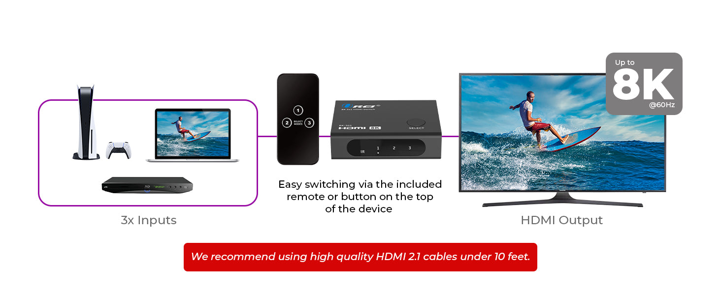 No drivers or external power supply are needed—simply plug in and play. The included IR remote offers easy source switching without needing to touch the unit, while the compact form factor fits perfectly in tight spaces. Designed for simplicity and performance, this HDMI 2.1 switch is a smart solution for any modern AV environment.