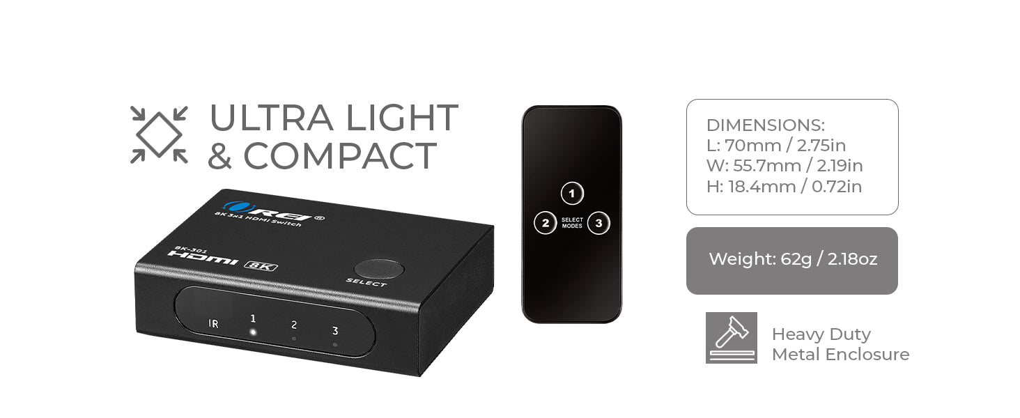 The BK-301 is a compact 3x1 HDMI switch that enables effortless switching between three HDMI sources on a single 8K or 4K display. Fully compliant with HDMI 2.1 and HDCP 2.3 standards, it delivers ultra-high-definition video at resolutions up to 8K@60Hz, with support for high-frame-rate formats including 4K@165Hz, 4K@144Hz, 4K@120Hz, and 1080p@240Hz.