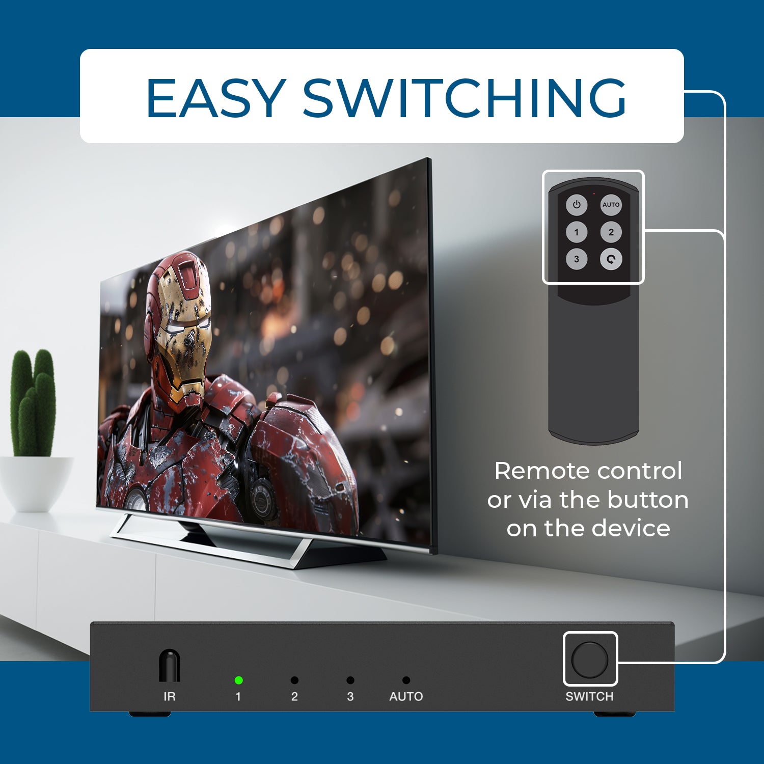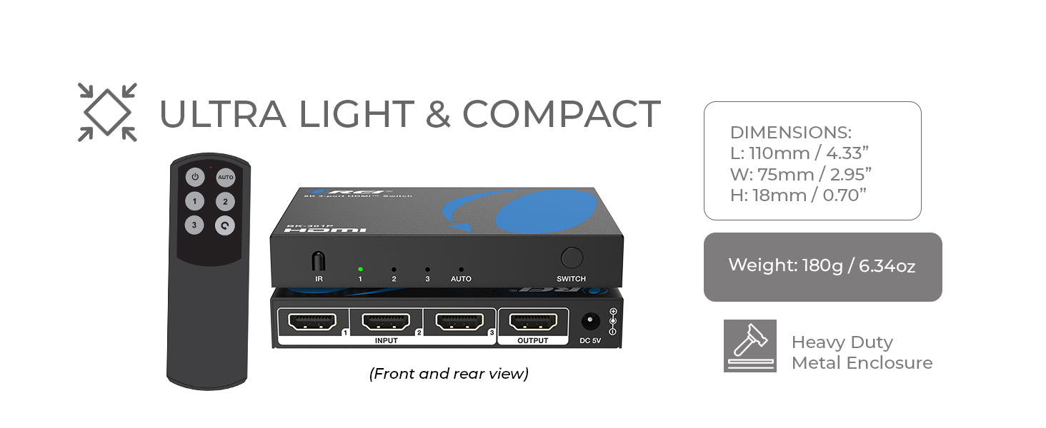 Convenient Control Options – Easily switch inputs via front panel buttons or included IR remote.