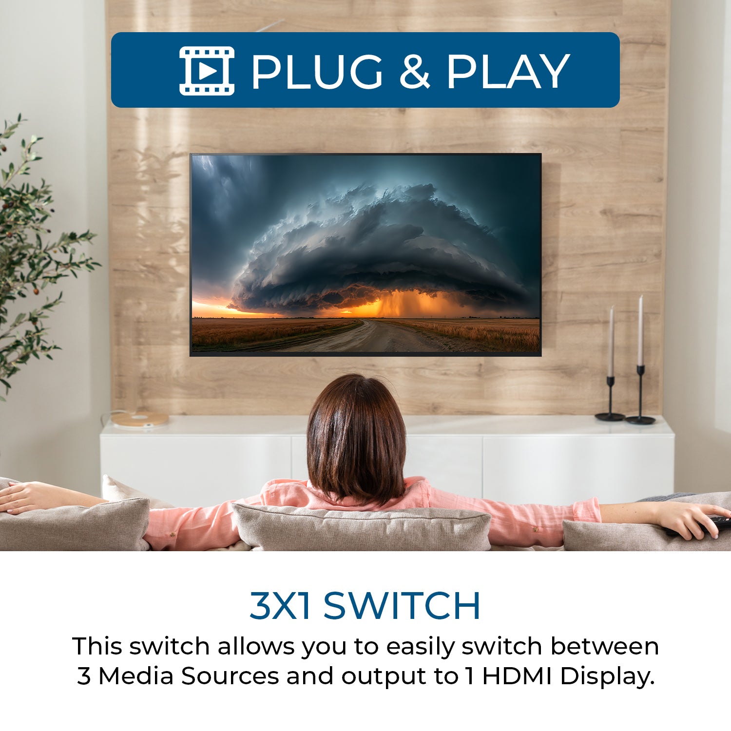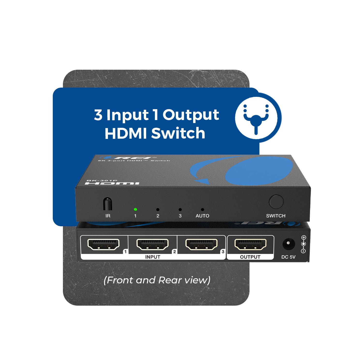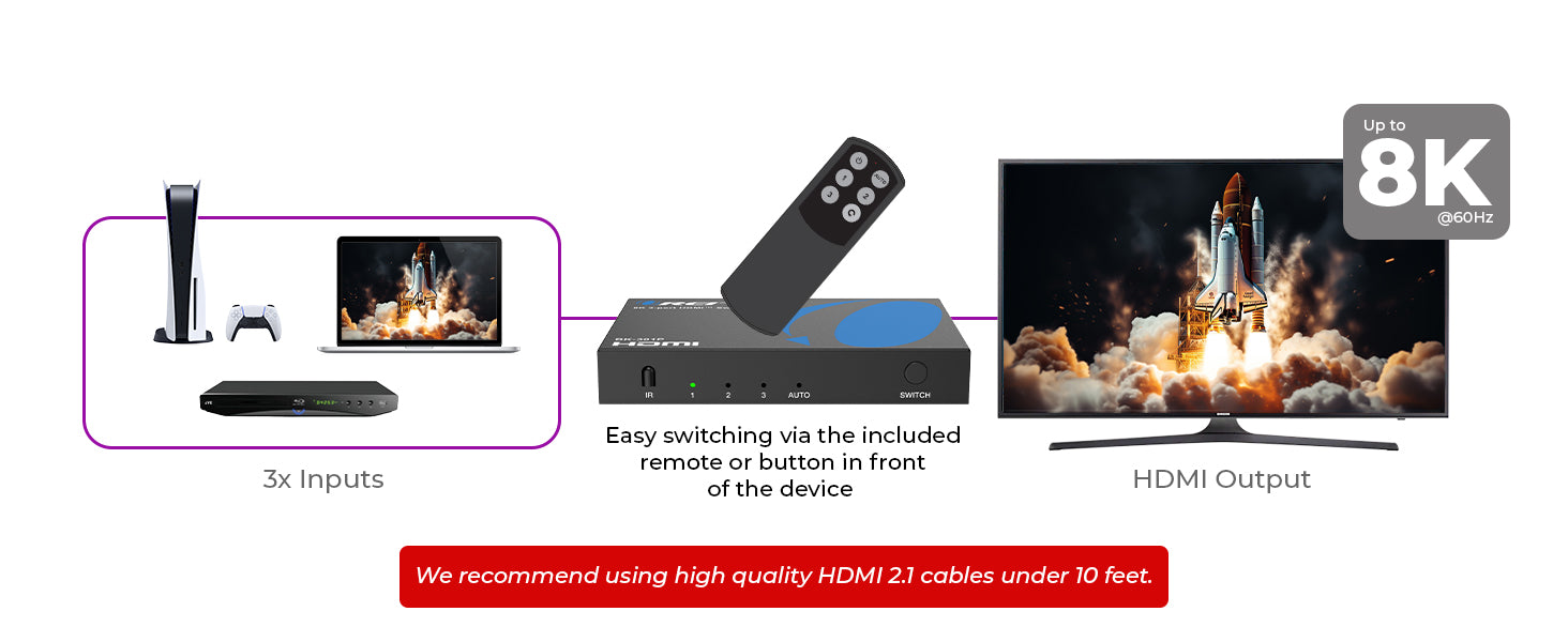 3x1 HDMI™ Switching – Three HDMI™ inputs routed to one HDMI™ output for flexible source selection.