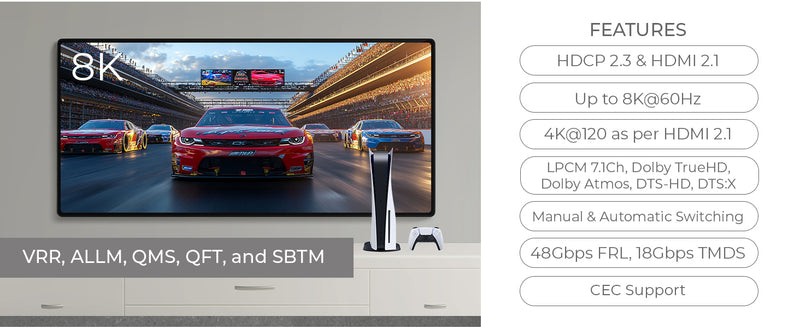 HDMI™ 2.1 Features Supported – Includes VRR, ALLM, QMS, QFT, and SBTM for enhanced video and gaming performance.