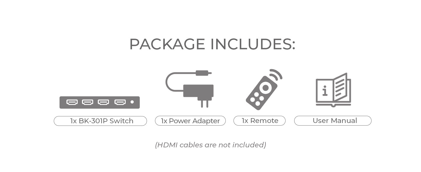 Designed for convenience, the BK-301P offers auto and manual input switching between three HDMI™ sources, with control options via front panel buttons or the included IR remote. CEC pass-through enables synchronized control between connected HDMI™ devices, simplifying system operation. Compact yet powerful, this HDMI™ switcher provides reliable, intelligent signal management for any modern AV environment.