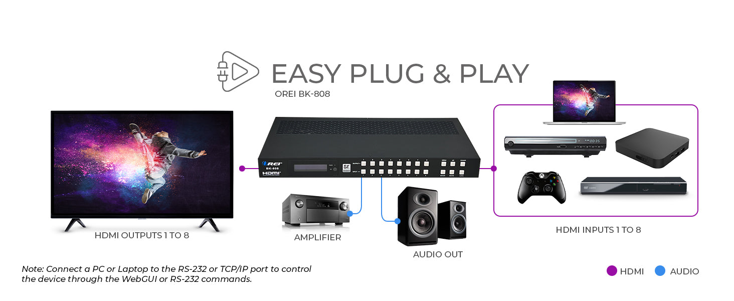 8x8 Matrix Switching – Independently route any input to any output without signal loss.
