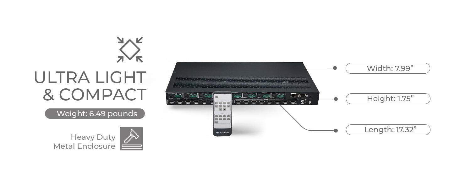 Multiple Control Options – Includes IR remote, front-panel buttons, RS-232, and web-based GUI for full control flexibility.