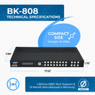 The BK-808 is a high-performance 8x8 HDMI matrix switcher that gives you complete routing flexibility—send any of eight HDMI sources to any of eight outputs independently. Whether you're managing a large AV installation, broadcast setup, or high-end home theater, this matrix switch provides rock-solid performance with no signal degradation, even across all outputs.