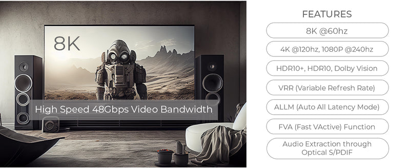 - 48Gbps Video Bandwidth – Delivers high-quality video and audio signals without degradation.