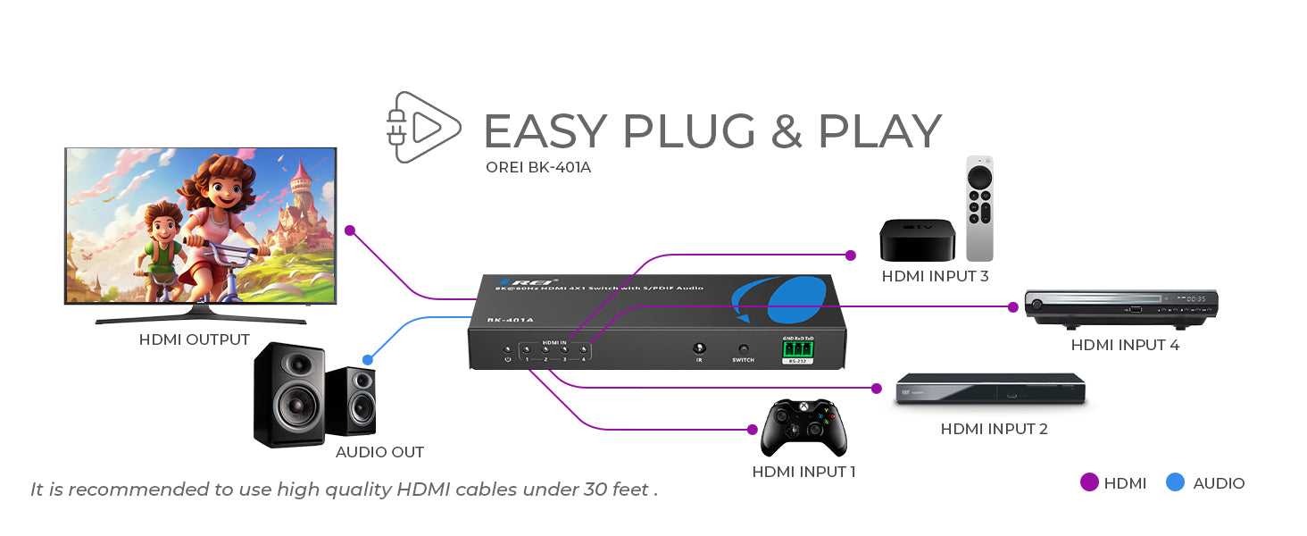 The OREI BK-401A is a premium 4x1 HDMI switch designed to connect up to four HDMI sources—such as gaming consoles, media players, or streaming boxes—to a single 8K or 4K display. Whether you're switching between a PS5, Apple TV, or high-end Blu-ray player, this switch HDMI 4 port offers seamless transitions with full support for HDMI 2.1 and HDCP 2.3 standards.