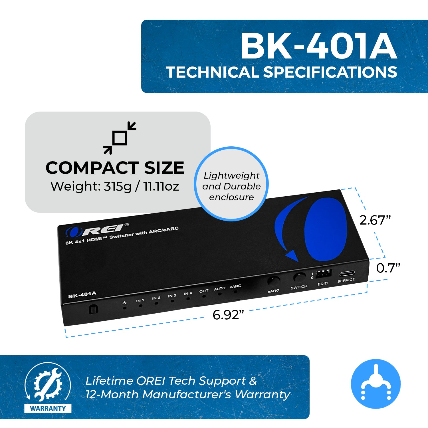 OREI BK-401ARC: 4x1 HDMI Switch with ARC/eARC Audio Extraction