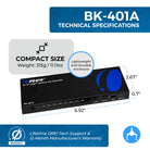 The BK-401ARC is a 4x1 HDMI switch that connects up to four HDMI sources to a single display while supporting ARC/eARC audio return and extraction through S/PDIF and L/R outputs. It’s compliant with HDMI 2.1 and HDCP 2.3, delivering video resolutions up to 8K@60Hz 4:2:0 and 4K@120Hz 4:4:4 with a bandwidth of 48Gbps FRL and 18Gbps TMDS.