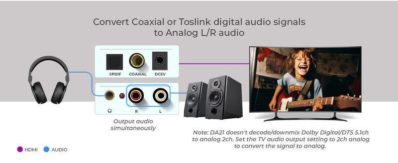 Enjoy simultaneous RCA L/R and 3.5mm headphone outputs, offering flexible connectivity to soundbars, amplifiers, or headphones. Whether you're using it as a dac converter for your speakers or personal listening device, the DA21 provides a hassle-free experience with plug-and-play simplicity.