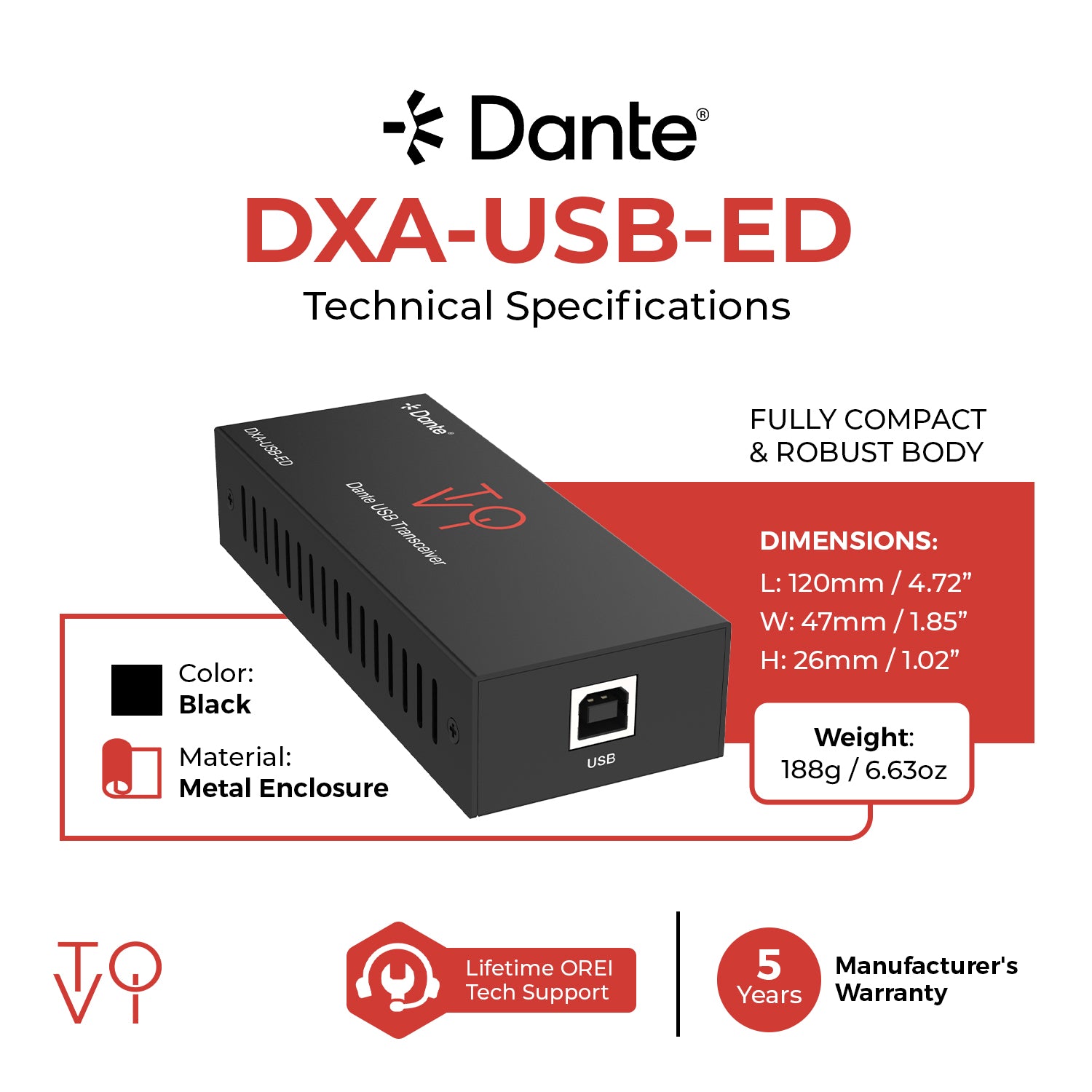 The ToVi DXA-USB-ED is a compact 2-channel Dante® USB audio transceiver designed to seamlessly bridge USB audio devices with professional Dante® audio networks. Built on the Dante® Ultimo platform, it functions as a high-quality USB sound card, enabling reliable audio-over-IP transmission for modern AV, broadcast, and live sound environments.