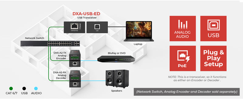 The DXA-USB-ED provides analog microphone input and speaker output, making it suitable for both capture and playback applications. It offers dual power flexibility, operating either from USB 5V power or PoE (IEEE 802.3af), allowing easy deployment in fixed installations or portable setups without additional power adapters.