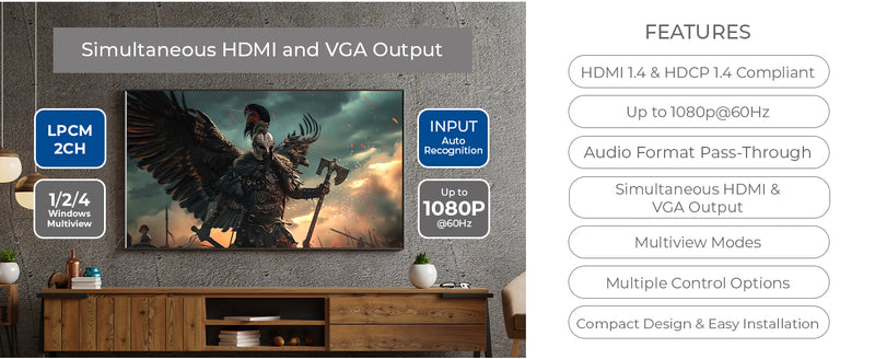 Compliant with HDMI™ 1.4 and HDCP 1.4, the unit supports video resolutions up to 1080p@60Hz, ensuring sharp and smooth full HD playback. Users can select from 1, 2, or 4-window multiview layouts, allowing customizable screen configurations to suit different monitoring and presentation needs.