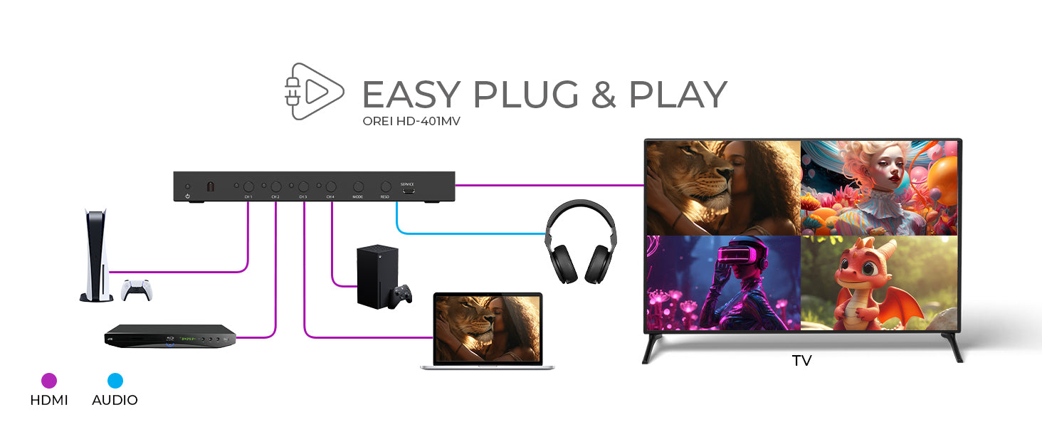 - 4 Inputs - 1 output HDMI Multiviewer switch