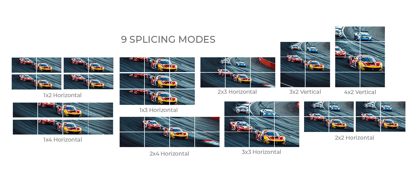 Multiple Splicing Modes – Flexible display arrangements including 1x2, 1x3, 1x4, 2x2, 2x3, 3x2, 2x4, 4x2, and 3x3 configurations.