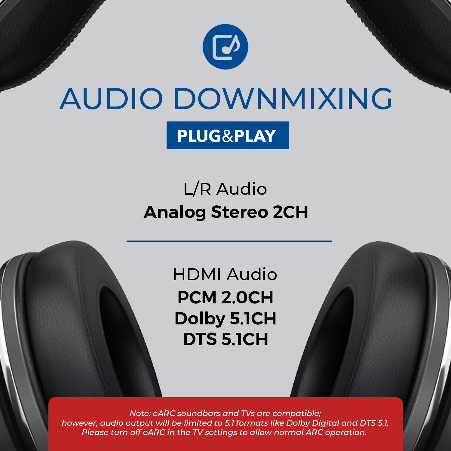 This ARC audio converter supports Dolby Digital 5.1 and DTS 5.1 down-mixing to clean, balanced 2-channel stereo audio without distortion or loss of clarity. At the same time, the original 5.1 surround audio is preserved on the HDMI™ ARC output for soundbars or AV receivers that support multi-channel playback.
