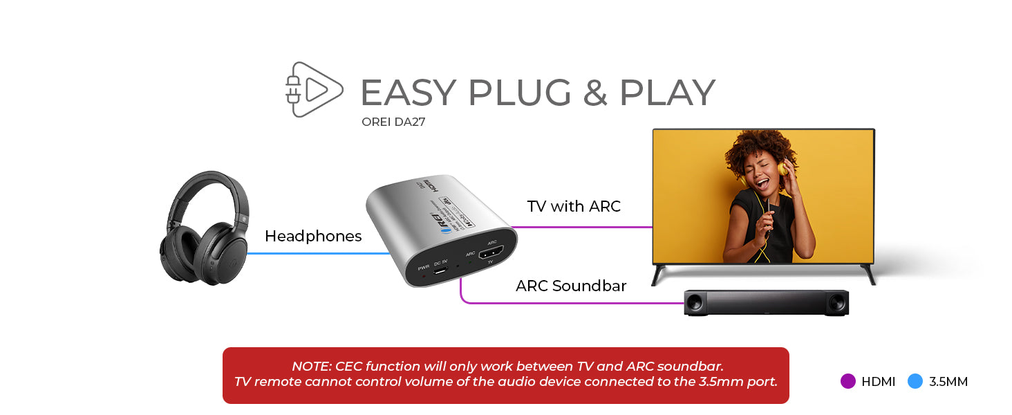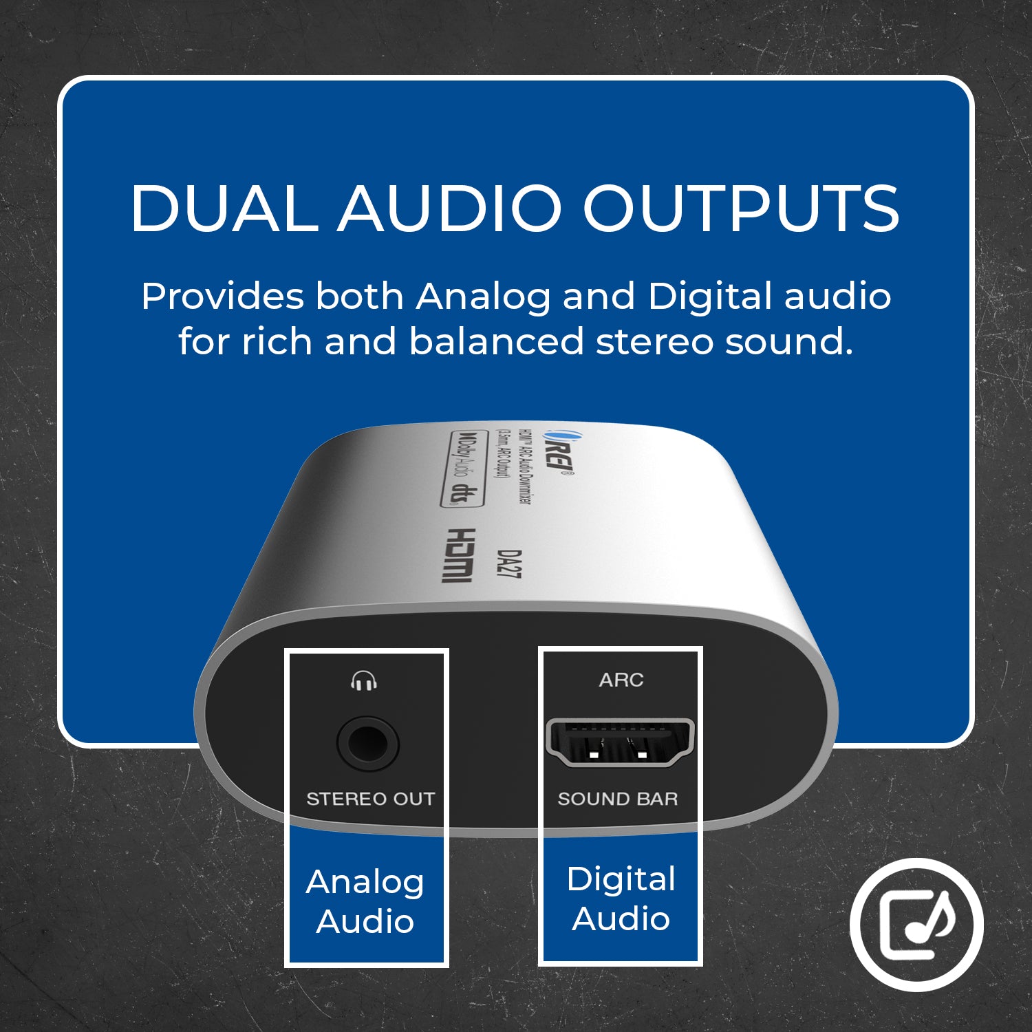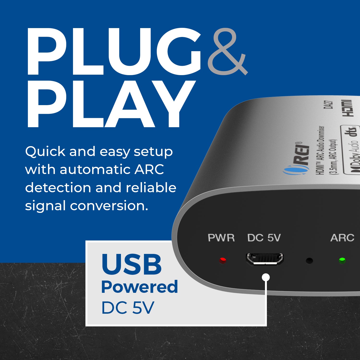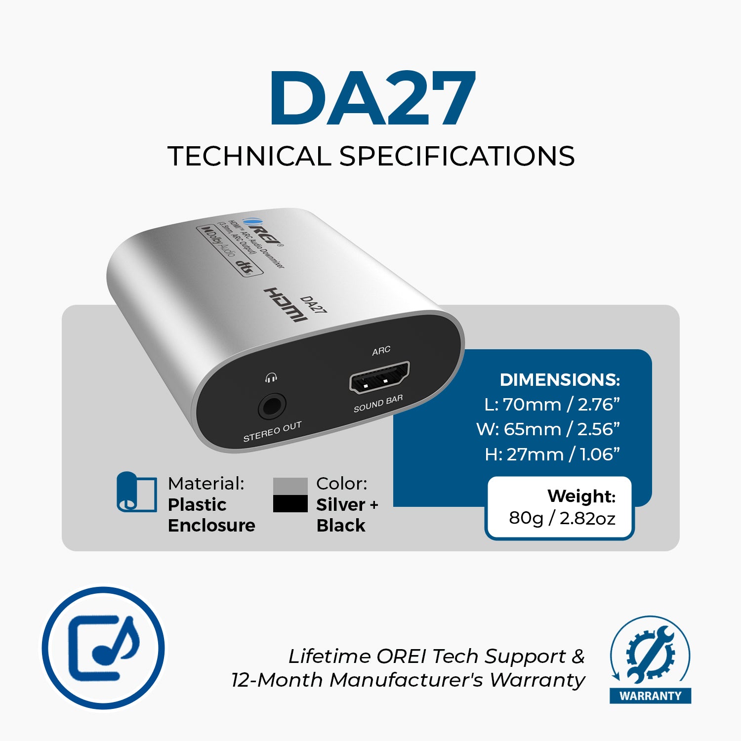 The OREI DA27 is a compact HDMI™ ARC audio downmixer designed to extract audio directly from ARC-enabled televisions. It converts TV audio into high-quality 2-channel analog stereo via a 3.5mm output while simultaneously maintaining digital audio through the HDMI™ ARC output, making it ideal for mixed analog and ARC-based audio setups.