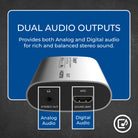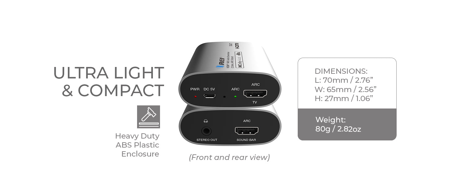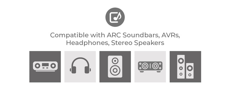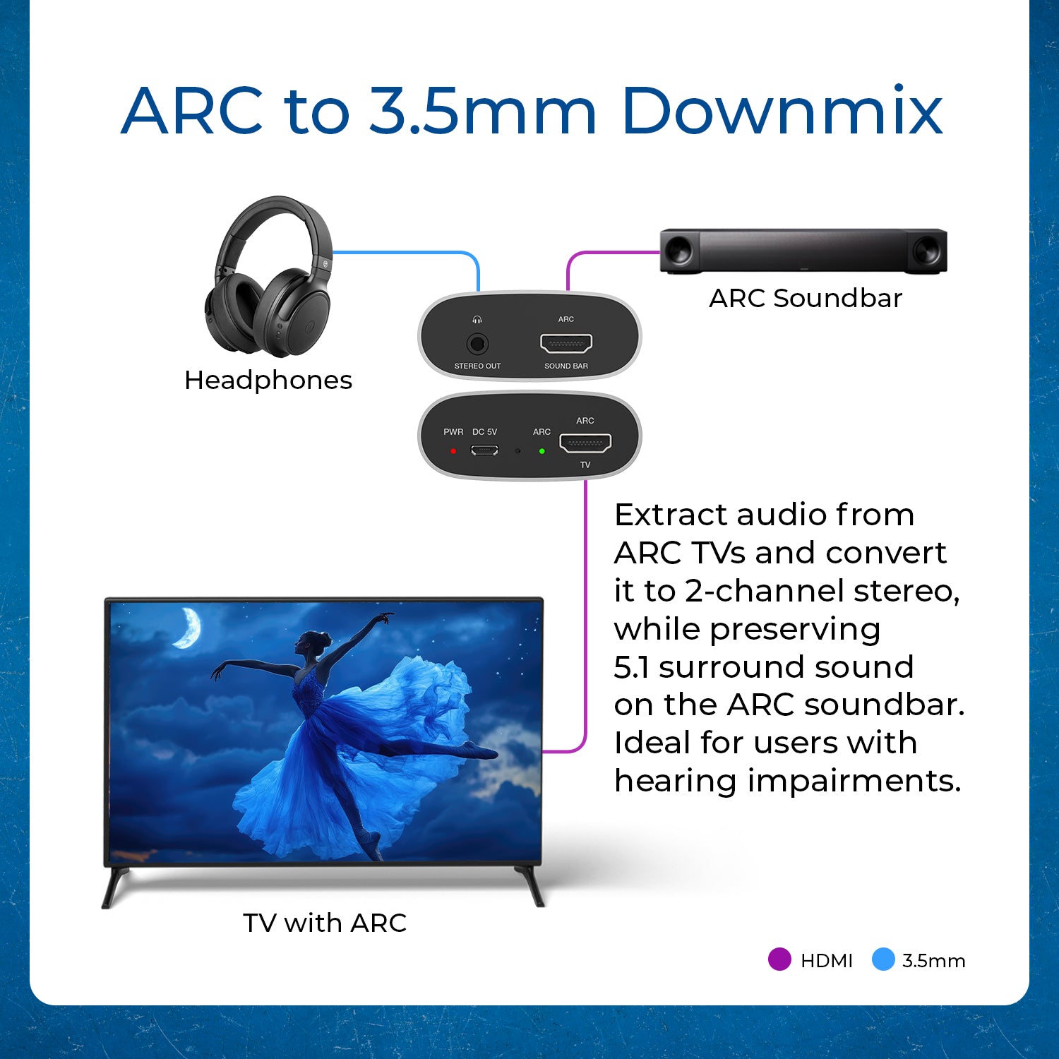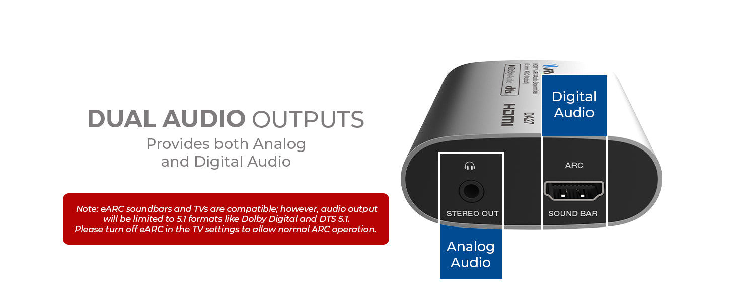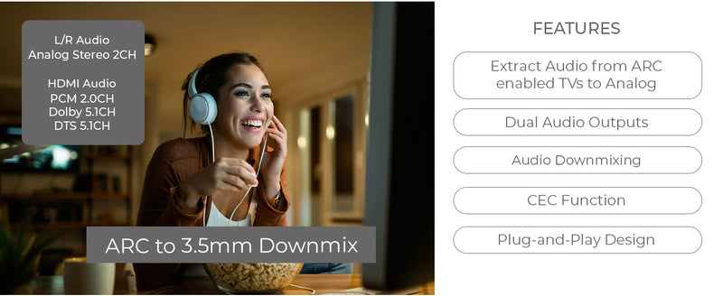 - ARC Enabled - Extracts audio from ARC-enabled TVs to analog stereo and HDMITM ARC output simultaneously.