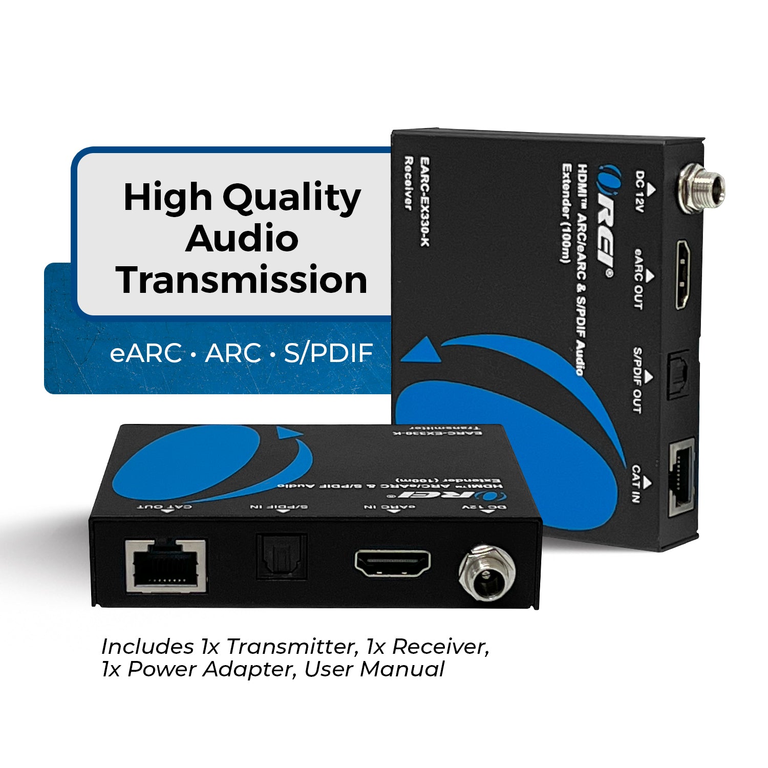 The EARC-EX330-K is a premium audio extender that transmits HDMI ARC/eARC and S/PDIF signals over a single CAT 6/7 cable up to 100 meters (330 feet). Designed to bridge your TV and amplifier or AVR system, it ensures high-quality audio transmission and full compatibility with advanced sound formats.