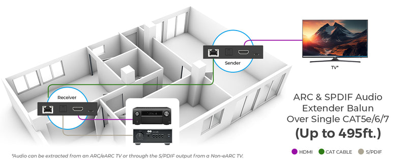 The ARC-EX300-K HDMI ARC extender transmits high-resolution ARC audio up to 492 feet (150 meters) at 96kHz or 295 feet (90 meters) at 192kHz using a single CAT cable. It’s the perfect arc over Cat6 solution for routing audio from your TV to an external amplifier or receiver without loss of quality—ideal for home theaters, conference rooms, and whole-home AV systems.