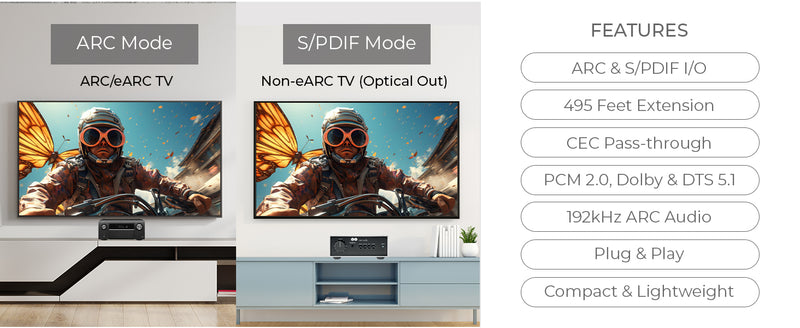 Long-Distance Audio Extension – Transmits HDMI ARC signals up to 492 ft (150 m) at 96kHz or 295 ft (90 m) at 192kHz over a single CAT cable.