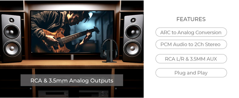 Supporting PCM audio, the DA25 converts digital signals into 2-channel stereo without distortion. With dual analog outputs—RCA and 3.5mm stereo jack—it offers flexible connection options for amplifiers, stereo systems, soundbars, and headphones. Perfect for those upgrading setups without HDMI ARC support.