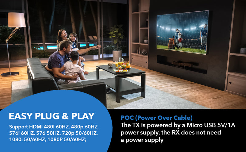 Powered by PoC (Power over Cable) technology, this system simplifies installation by requiring only one power adapter—connected at the transmitter end—to run both units. This reduces cable clutter and installation complexity, especially in tight or hidden spaces.