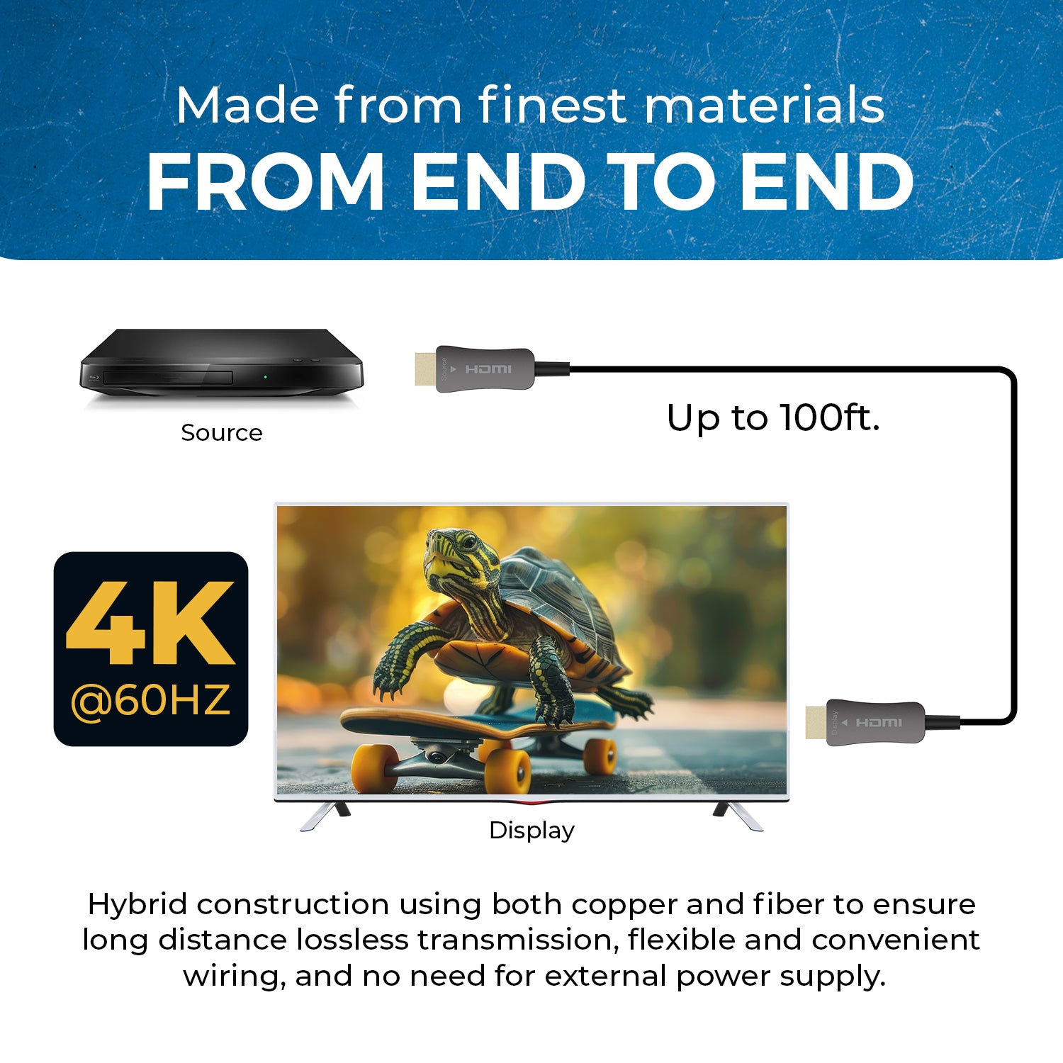 With a hybrid design combining copper and optical fiber, the cable eliminates electromagnetic interference, delivering stable, uncompressed video and audio signals up to 100 feet (~30.5 meters).