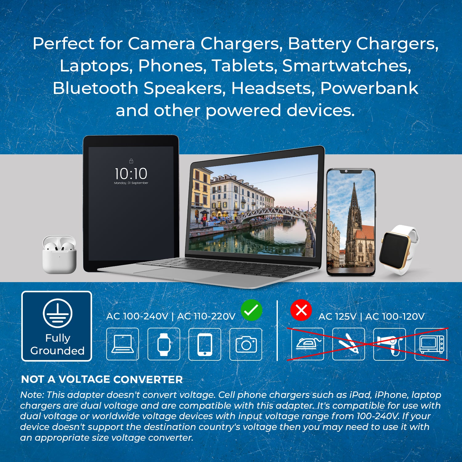 - Compatible Devices: Ideal for dual voltage products like phones, chargers, and laptops.