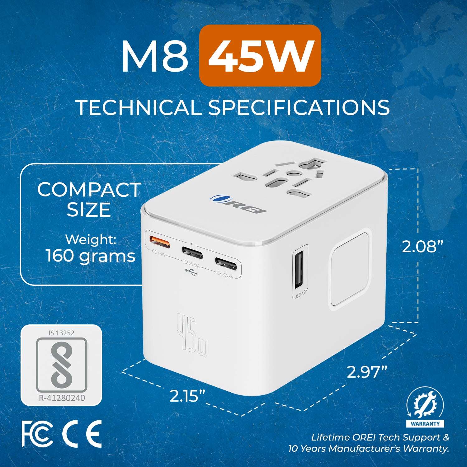 Designed in the USA with safety as a priority, this adapter includes surge protection, an 8A fuse with spare, safety shutters, and a plug-lock system, all certified by RoHS, CE, and FCC. Lightweight, durable, and backed by a 1-year warranty, the OREI travel adapter is the ideal companion for safe and hassle-free charging wherever you go.