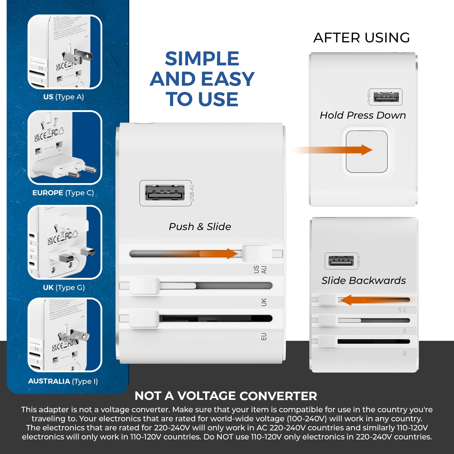 - Global Plug Compatibility – Works with Type A, C, G, I (150+ countries).