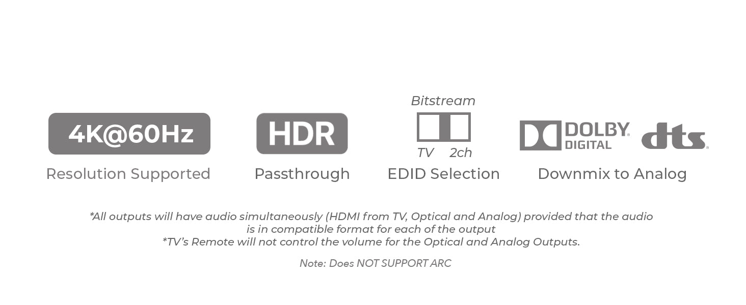 Extract and downmix multi-channel audio formats including Dolby Digital, DTS, and LPCM into crisp 2-channel stereo output. Whether you're using a HDMI to RCA audio adapter or a HDMI to SPDIF converter, this device delivers premium sound through optical and analog outputs while preserving HDMI pass-through audio.