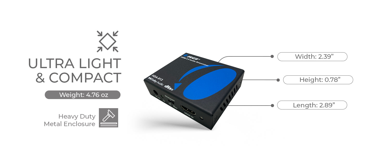 The HDA-913 is a high-performance HDMI audio extractor built for seamless integration into home theater and professional AV systems. It extracts digital HDMI audio and converts it to SPDIF optical and analog stereo RCA outputs—ideal for use with amplifiers, speakers, or soundbars that lack HDMI input.