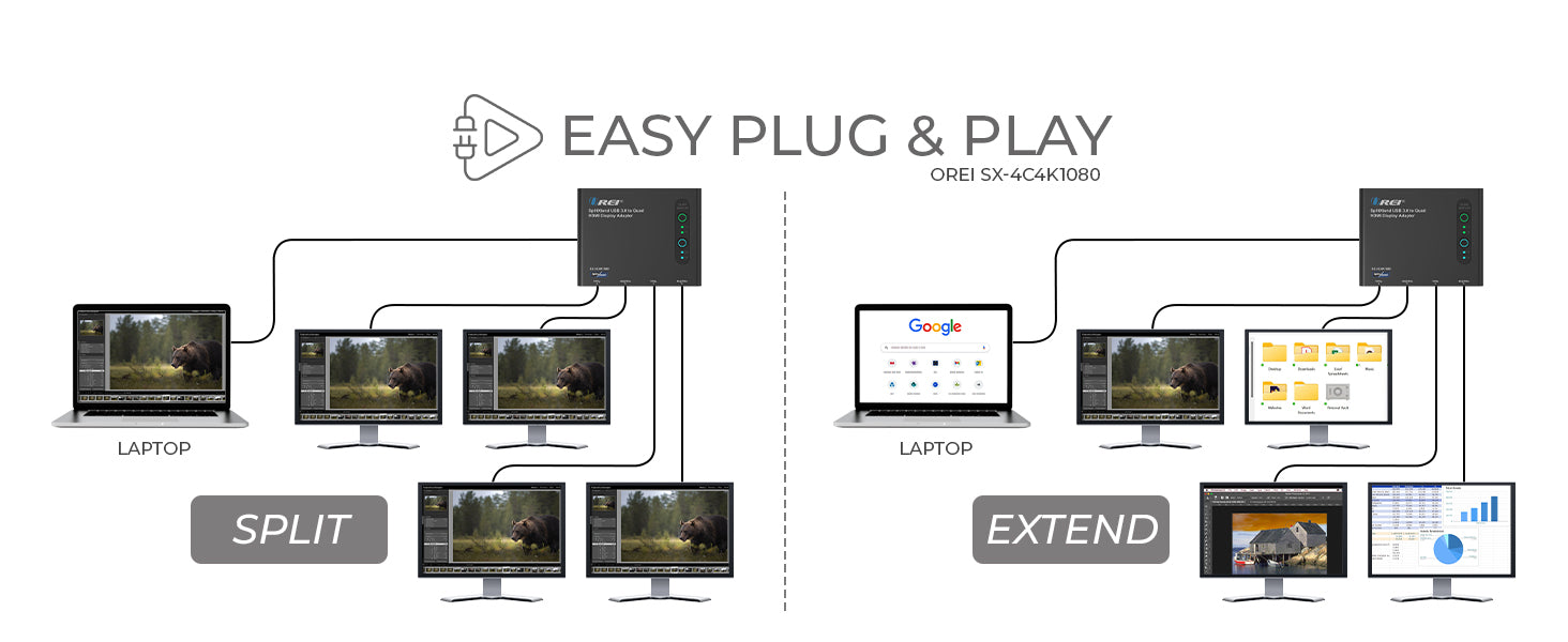 The SplitXtend SX-4C4K1080 transforms your laptop into a powerful multi-monitor workstation by extending or mirroring your screen across four external displays. It supports two monitors at 4K@30Hz and two at 1080p@60Hz—perfect for productivity tasks like spreadsheets, presentations, and creative work. Whether at home or in the office, it’s an efficient solution for anyone needing an hdmi splitter extended display setup.