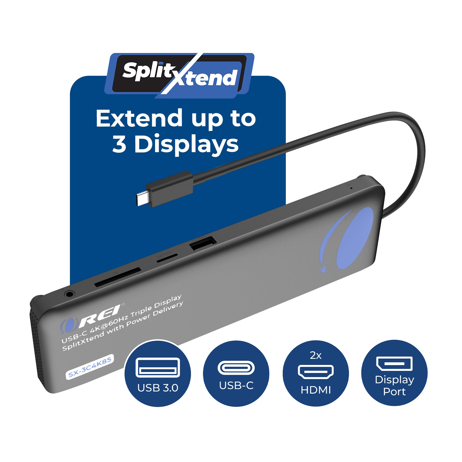 OREI SplitXtend Docking Hub with USB-C input, USB-A, Ethernet, DP, Power delivery up to 85 Watt and up to 3 Extended Displays (SX-3C4K85)