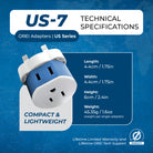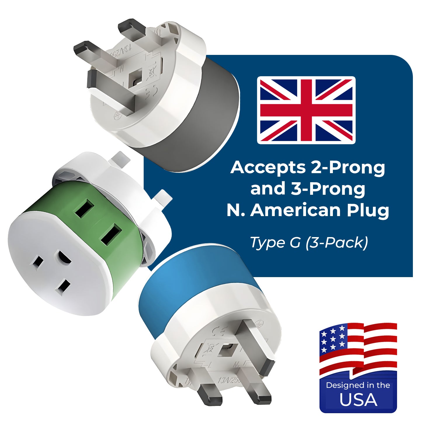The US-7 is designed in the US and it’s our top choice for travel adapter to use in Type G outlets. It's compatible for use with dual voltage or worldwide voltage devices .It features one socket to connect a N. American 2-prong or a 3-prong power cord to charge your devices.