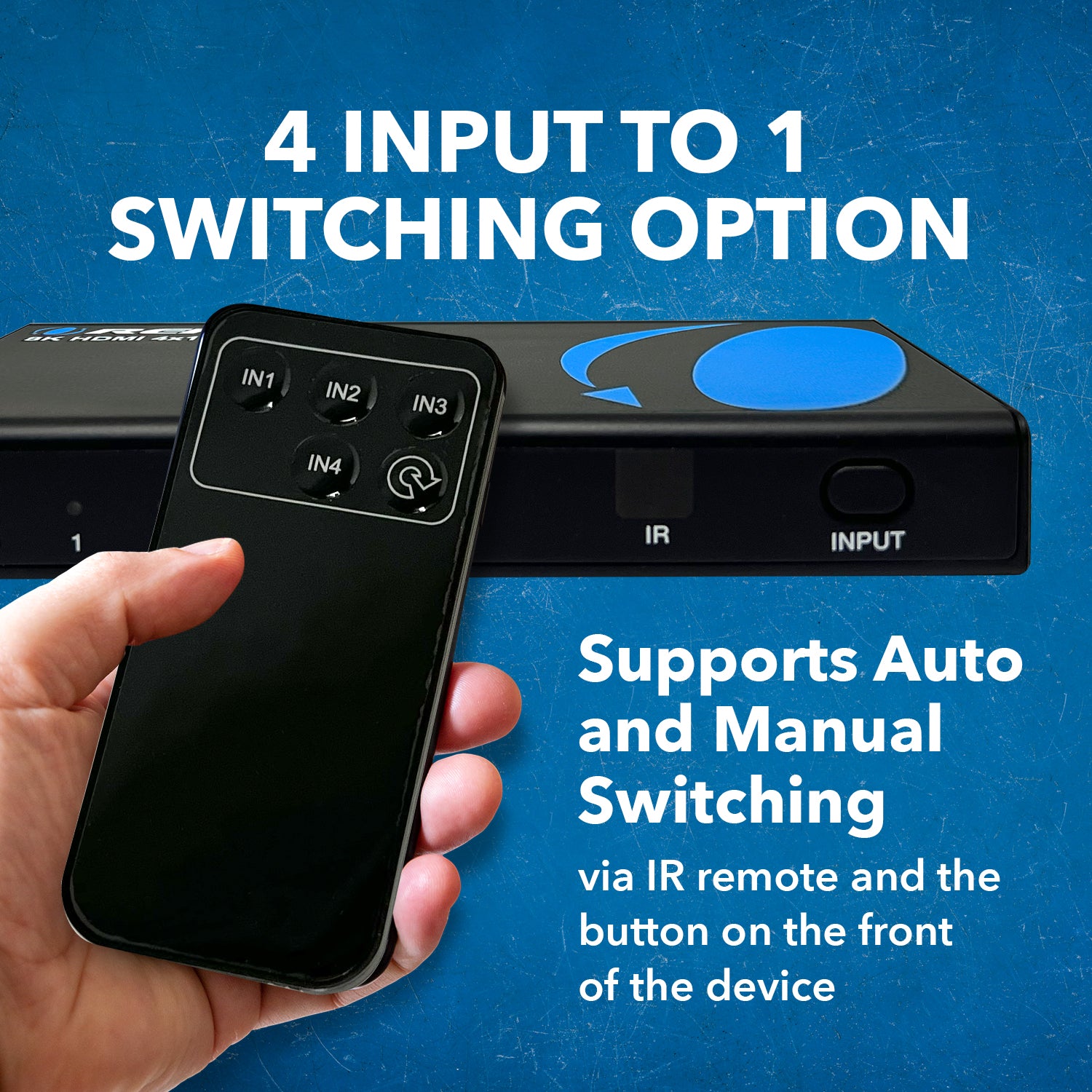 The 8K HDMI 4x1 switcher lets you connect four HDMI devices to a single display, easily managing multiple sources with the push of a front-panel button. Designed for quick, reliable switching, this switcher HDMI 4x1 is perfect for home theaters, gaming setups, video conferencing, and more. Simplify your AV experience with this versatile switch HDMI port solution.