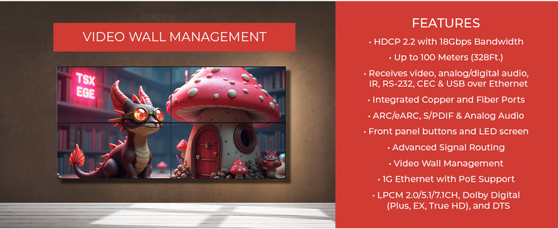 It extends AV signals up to 100 meters (328 feet) over CAT6/6A/7 cables, transmitting video, analog and digital audio, IR, RS-232, CEC, and USB data seamlessly over Ethernet.