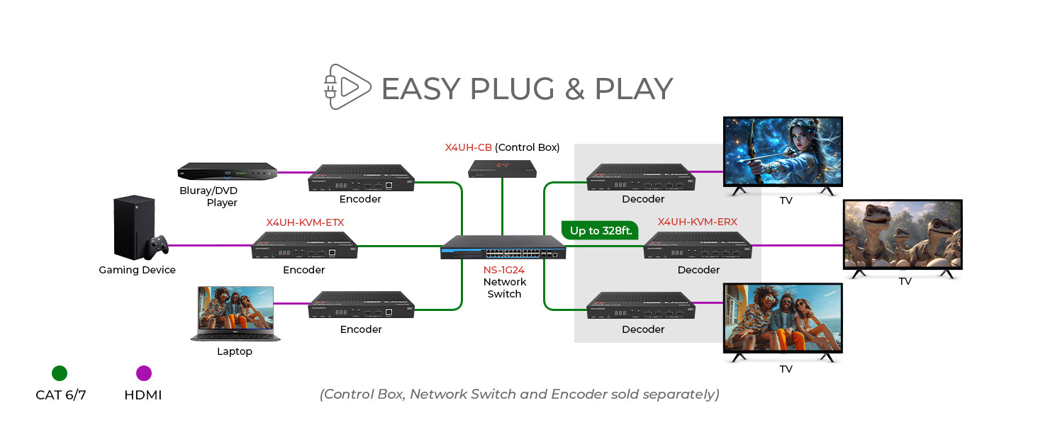 • Long-Distance Extension – Extends AV signals up to 100 meters (328 feet) over CAT6/6A/7 cables.