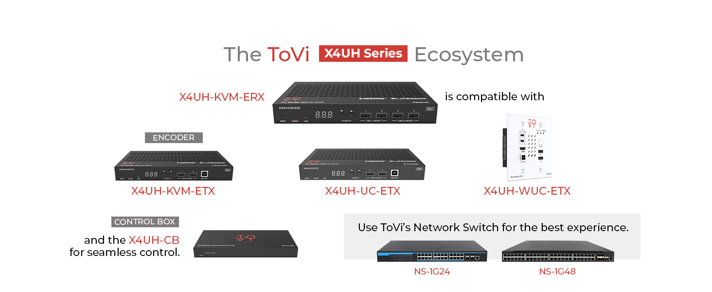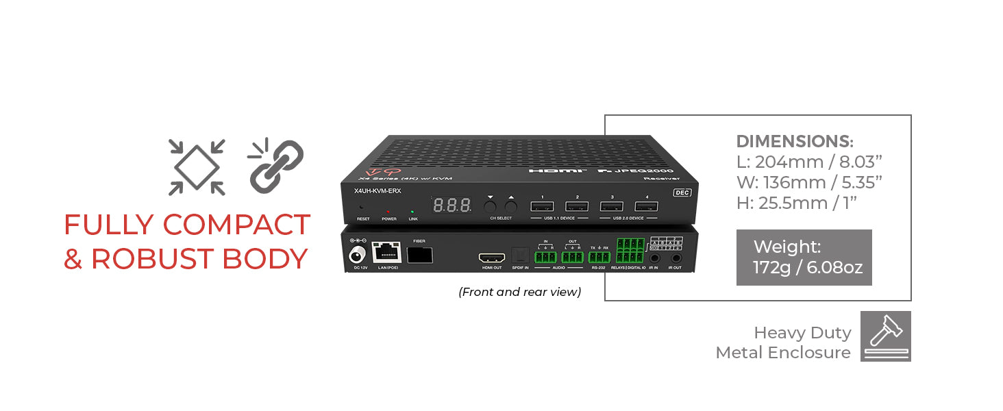 The ToVi X4UH-KVM-ERX is HDMI 2.0b and HDCP 2.2 compliant, delivering pristine 4K@60Hz (4:4:4) video with 18Gbps bandwidth for uncompromised ultra-high-definition quality. It simultaneously transmits video, analog and digital audio, IR, RS-232, CEC, and USB over Ethernet, ensuring full-featured AV-over-IP operation for professional environments.