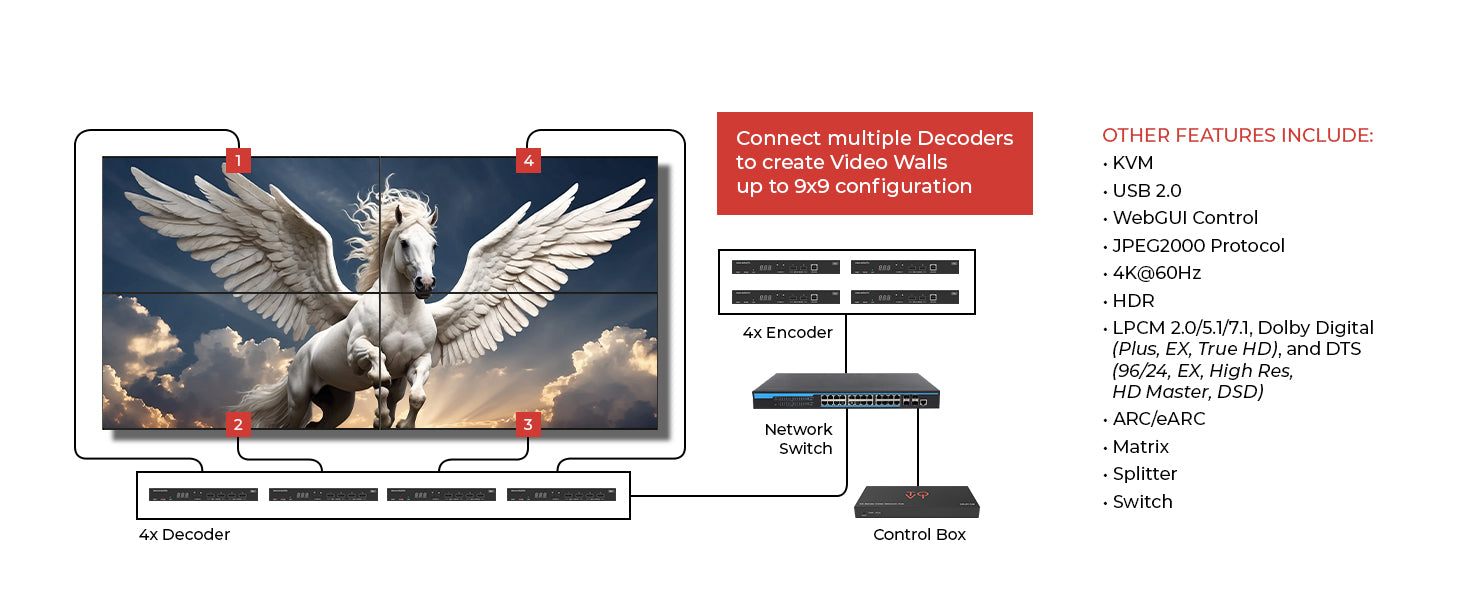 • Advanced Signal Routing – Supports unicast, multicast, point-to-point, matrix switching, and video wall functionality (up to 9x9).