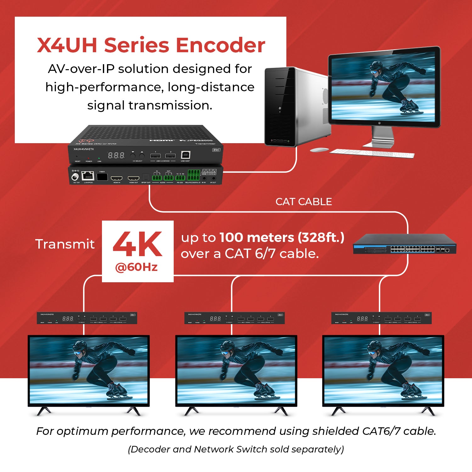 Long-Distance Extension – Extends AV signals up to 100 meters (328 feet) over CAT6/6A/7 cables.