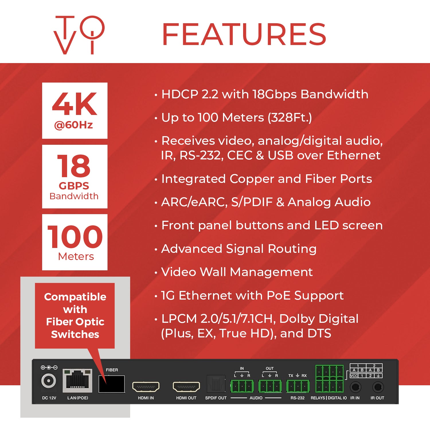 It extends AV signals up to 100 meters (328 feet) over CAT6/6A/7 cables, transmitting video, analog and digital audio, IR, RS-232, CEC, and USB data seamlessly over Ethernet.