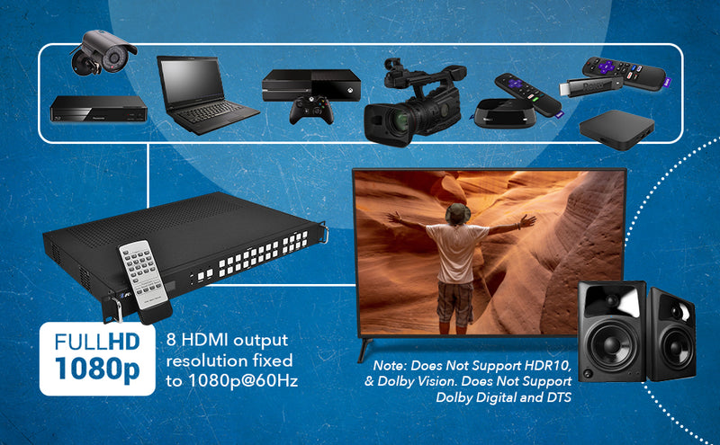 - 8×8 Seamless Matrix Switching – Instantly switch between eight HDMI sources and eight HDMI displays with zero blackout or lag.