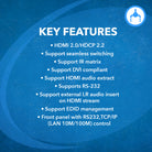 This matrix offers seamless switching between sources with zero latency or black screen interruptions, and includes built-in video wall capabilities and IR matrix routing that mirrors video paths.It also supports HDMI audio extraction and external analog stereo audio insertion, offering robust options for audio management within complex AV environments.