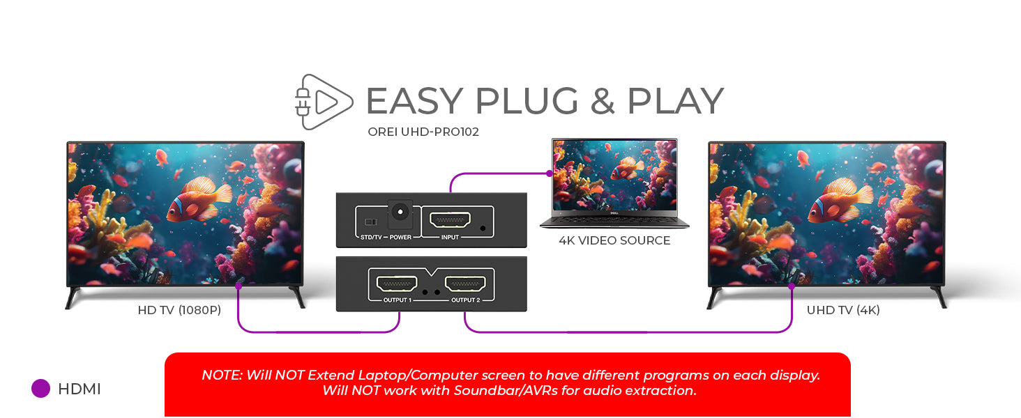 OREI UHD PRO -102: 4K 1x2 HDMI Splitter with Auto Downscale & EDID management