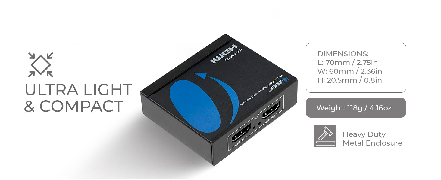 The UHD-PRO102 is a compact 1x2 HDMI splitter designed to duplicate one HDMI source to two displays with maximum clarity and efficiency. Fully compliant with HDMI 2.0b and HDCP 2.2 standards, it supports resolutions up to 4K@60Hz with 18Gbps video bandwidth.