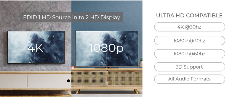 - Auto Downscale Function – Automatically outputs 1080p to one display while maintaining 4K on another.