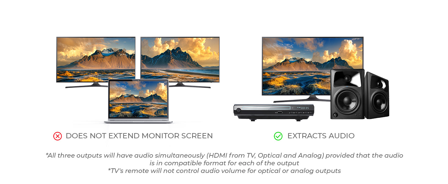 - Audio Extraction – Outputs audio through Optical and 3.5mm stereo ports for flexible connectivity.