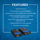 With support for data transfer speeds up to 200Mbps, this USB 2.0 extender over Ethernet ensures smooth performance for connected devices like printers, scanners, and external drives. The dual USB 2.0 outputs at the receiver allow simultaneous connection of two devices, maximizing productivity and operational efficiency.